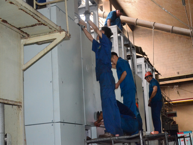 圖為施工人員對(duì)設(shè)備進(jìn)行安裝工作。