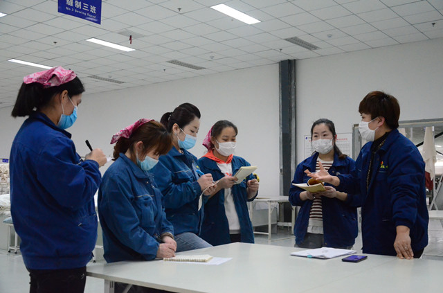 圖為家紡成品車間生產(chǎn)主管王新燕在與班組長、一線員工代表等開展“腦風(fēng)暴”的情形。