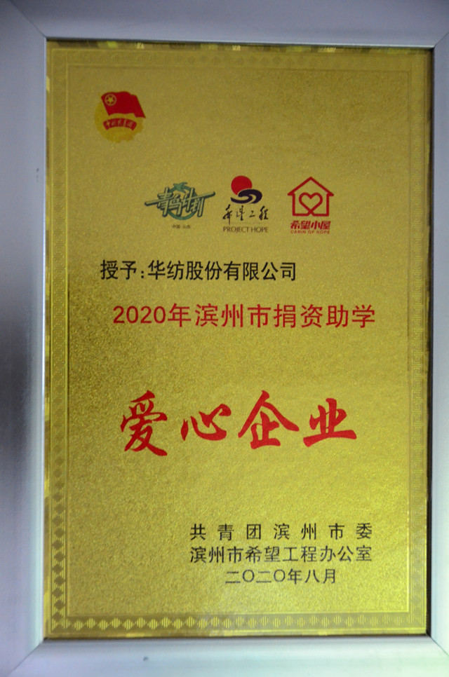 活動(dòng)現(xiàn)場(chǎng),公司被授予2020年濱州市捐資助學(xué)愛心企業(yè)。公司團(tuán)委積極響應(yīng)團(tuán)市委的倡議,組織開展了“希望小屋”愛心募捐活動(dòng),各部室、各車間組織愛心募捐,各工會(huì)干部、團(tuán)支部書記踴躍帶頭,全公司廣大干部職工參與廣泛,充分體現(xiàn)出華紡人擔(dān)當(dāng)?shù)纳鐣?huì)責(zé)任精神。