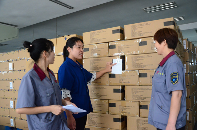 圖為服裝車間計(jì)劃管理員陳燕紅(中)在與質(zhì)量部質(zhì)檢人員一起,對接即將發(fā)出的出口產(chǎn)品。