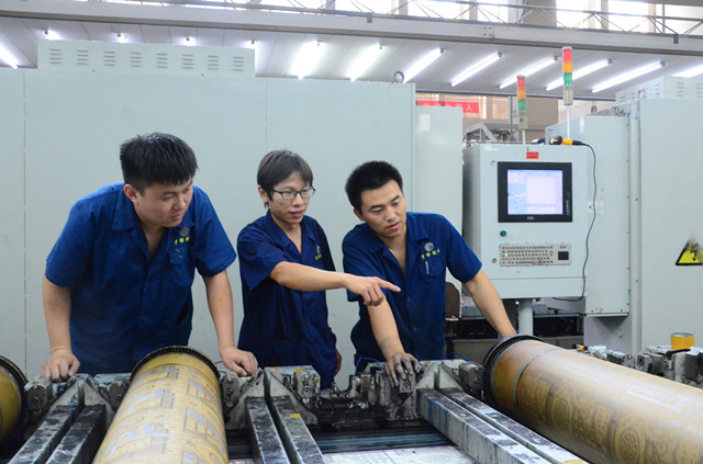 圖為輪班長(zhǎng)張楠楠(中)與本班兩位印花機(jī)擋車工,在現(xiàn)場(chǎng)討論質(zhì)量改進(jìn)的情形。