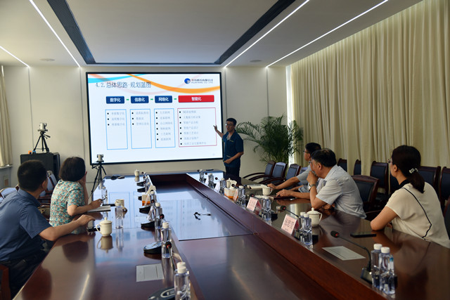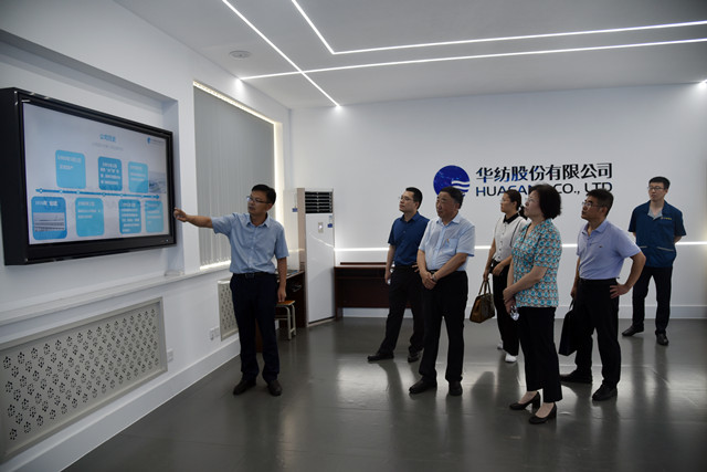 曹學軍一行先后參觀了花布車間、綜合辦公區(qū)、家紡展廳、研發(fā)創(chuàng)意中心、工程技術研究院、智云中心等部門和區(qū)域,并聽取了公司推進智能綠色工廠建設情況的匯報。