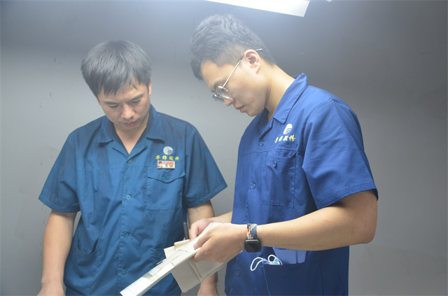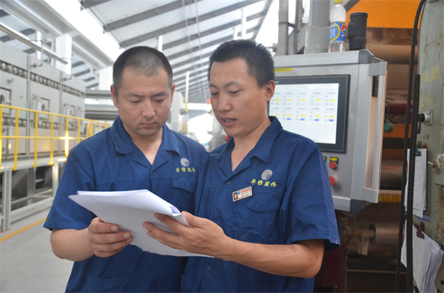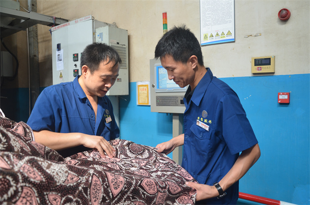 花布車間現(xiàn)場主管紀方超(右)與焙烘機機長孫海雷,在查看金粉印花生產(chǎn)質(zhì)量。