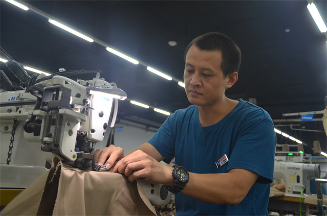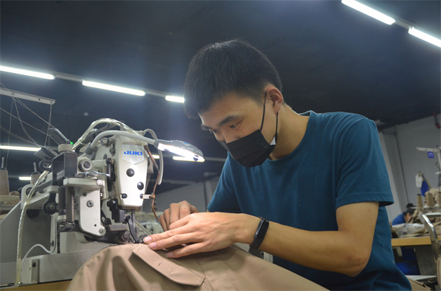 服裝車間縫制二班多能工郭叢叢進入公司10年來,靠著不斷追求精進,成長為對服裝生產(chǎn)各環(huán)節(jié)駕輕就熟的“老把式”。