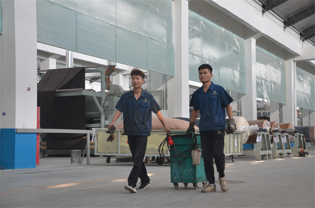 家紡車間丙班水洗機新員工劉叢叢(左),正在接受師傅的現(xiàn)場培訓與指導。