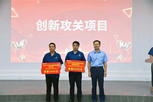 會(huì)上,李風(fēng)明宣讀了公司對(duì)2022年上半年度CQI項(xiàng)目、創(chuàng)新攻關(guān)成果等表彰決定;盛守祥為CQI項(xiàng)目代表、創(chuàng)新攻關(guān)一等獎(jiǎng)項(xiàng)目代表頒發(fā)獎(jiǎng)勵(lì)牌,總經(jīng)理閆英山為各車(chē)間創(chuàng)新攻關(guān)其他受獎(jiǎng)項(xiàng)目代表頒發(fā)獎(jiǎng)勵(lì)牌,李風(fēng)明為質(zhì)量之星、效率之星、工藝操作之星受獎(jiǎng)代表頒發(fā)榮譽(yù)證書(shū),公司安全總監(jiān)孫中然為現(xiàn)場(chǎng)6S之星、精益提案之星受獎(jiǎng)代表頒發(fā)榮譽(yù)證書(shū)。會(huì)議由公司團(tuán)委書(shū)記陳冰主持。