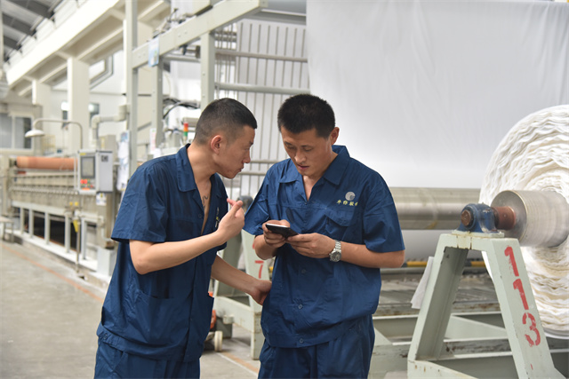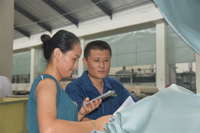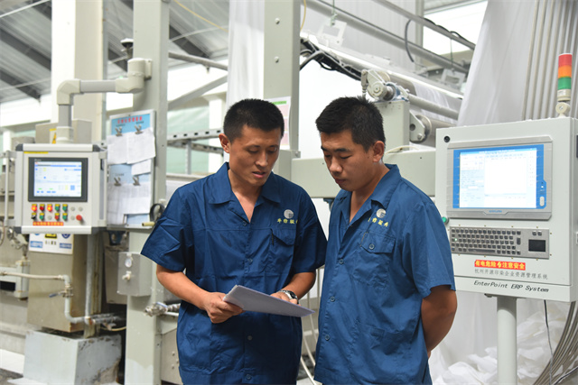 孫鎮(zhèn)身著工裝,每天巡回在車(chē)間前處理機(jī)臺(tái)之間,和暢的機(jī)聲成了他工作之時(shí)的伴奏。落實(shí)各機(jī)臺(tái)的計(jì)劃,組織各機(jī)臺(tái)生產(chǎn)跟進(jìn),管控本班的產(chǎn)品質(zhì)量,對(duì)操作規(guī)范進(jìn)行及時(shí)檢查、現(xiàn)場(chǎng)糾偏與指導(dǎo)培訓(xùn)。他一心撲在工作上,每天忙得不亦樂(lè)乎,目標(biāo)是帶領(lǐng)全班19名成員保質(zhì)保量地完成車(chē)間下達(dá)的任務(wù)目標(biāo)。他說(shuō),“做好生產(chǎn)工作有兩件法寶:一個(gè)是責(zé)任感,一個(gè)就是精益生產(chǎn)意識(shí)。”在孫鎮(zhèn)的心目中,作為公司的管理主線(xiàn),精益生產(chǎn)需要全體“華紡人”共同傾心“打磨”,在時(shí)間里“磨”出真功夫來(lái),干工作沒(méi)有捷徑,反復(fù)推敲,仔細(xì)琢磨;經(jīng)過(guò)工作實(shí)踐的摸爬滾打,才能提升自身本領(lǐng),才會(huì)使生產(chǎn)工作一步步精進(jìn)。