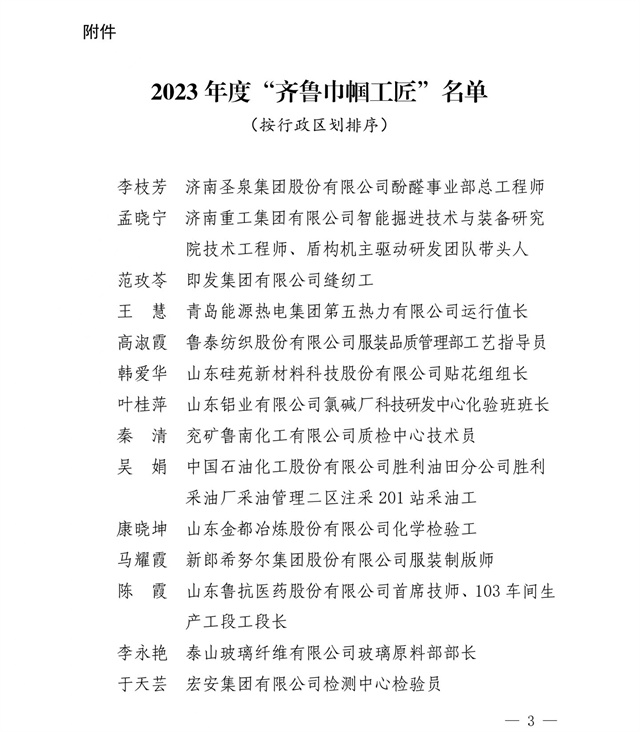 為大力弘揚(yáng)勞模精神、勞動精神、工匠精神,努力建設(shè)知識型、技能型、創(chuàng)新型女性勞動者大軍。近日,山東省婦女聯(lián)合會、山東省總工會發(fā)布了“關(guān)于公布2023年度‘齊魯巾幗工匠’的通知”,公司染化料配制工郭冬梅名列其中。