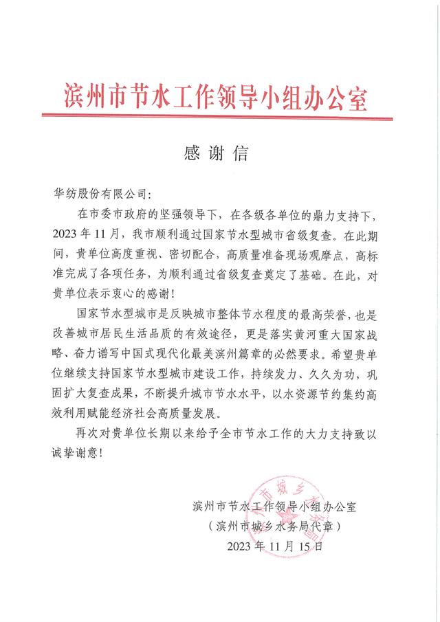 近日,濱州市節(jié)水工作領(lǐng)導(dǎo)小組辦公室向公司發(fā)來一封感謝信,信中指出:“2023 年11月,我市順利通過國家節(jié)水型城市省級復(fù)查。在此期間,貴單位高度重視、密切配合,高質(zhì)量準(zhǔn)備現(xiàn)場觀摩點(diǎn),高標(biāo)準(zhǔn)完成了各項(xiàng)任務(wù),為順利通過省級復(fù)查奠定了基礎(chǔ)。”