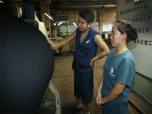 圖為面三車間丙班2#拉幅機擋車工李良(左)與出檢工崔月華,在查看產(chǎn)品質(zhì)量。