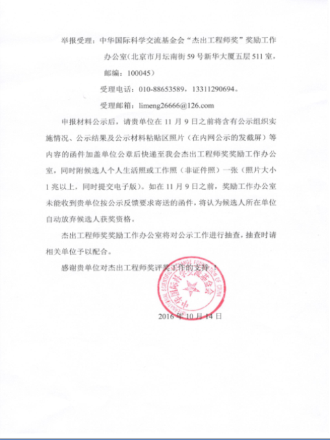 2、關(guān)于做好中華國(guó)際科學(xué)交流基金會(huì)“杰出工程師獎(jiǎng)”獲獎(jiǎng)候選人公示工作的通知