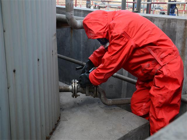 鍋爐班長接到氨水泄漏報告后,立即指定兩名人員穿著化學防護服、佩戴防毒面具及防護眼鏡到達現(xiàn)場,檢查具體泄漏情況。與此同時,當班班長第一時間向安全專工、鍋爐工段長及經(jīng)理匯報泄漏情況,現(xiàn)場禁止一切火源。