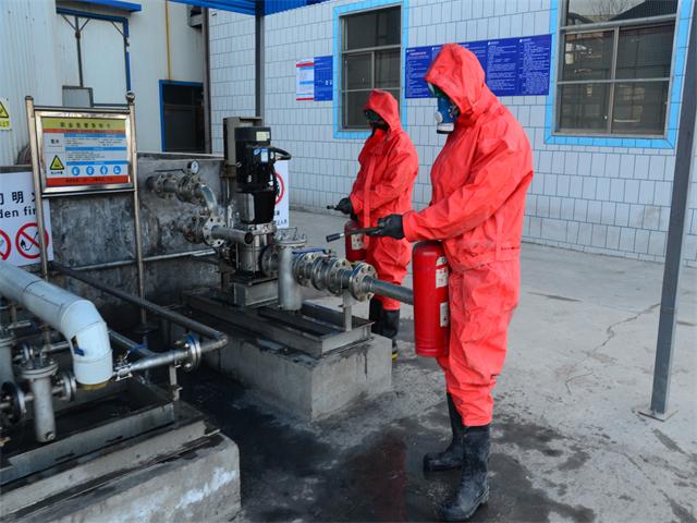 這一幕正是動力公司2月20日進行防泄漏演練時的情形。當日,動力公司按照公司安保部制定的年度應急預案演練大綱,進行了一次氨水泄漏應急處理演練。同日,面一車間進行了導熱油泄漏現(xiàn)場處置演練。經(jīng)安保部和部門主管測評,兩次演練均符合流程標準,達到了預期效果。