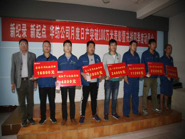 10月11日,公司召開(kāi)主題為“新紀(jì)錄,新起點(diǎn),華紡公司月度日產(chǎn)突破100萬(wàn)米表彰暨決戰(zhàn)四季度動(dòng)員會(huì)”,會(huì)上對(duì)在9月份印染生產(chǎn)計(jì)劃完成工作中成績(jī)優(yōu)異的55個(gè)機(jī)組和41位個(gè)人進(jìn)行了表彰獎(jiǎng)勵(lì),對(duì)第四季度工作進(jìn)行了部署。